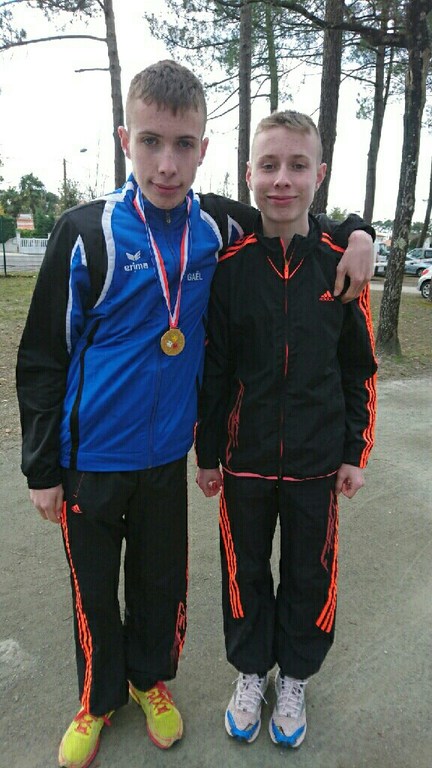 Gaël champion de France cadet avec une superbe course laissant son dauphin très loin à 1 minute. Theo est 4 ieme dommage avec la Grippe. Tous les deux sont sélectionnés stage de détection équipe de France à Reims 14 au 17 avril. Il est en photo avec BOUTASGHOUNT Rachid vainqueur du cross senior. Pour info médaille de bronze au championnat du monde indoor sur 3000M en 8'54 et au Mans sur les France FFA 94 ème Félicitations Theo et Gael