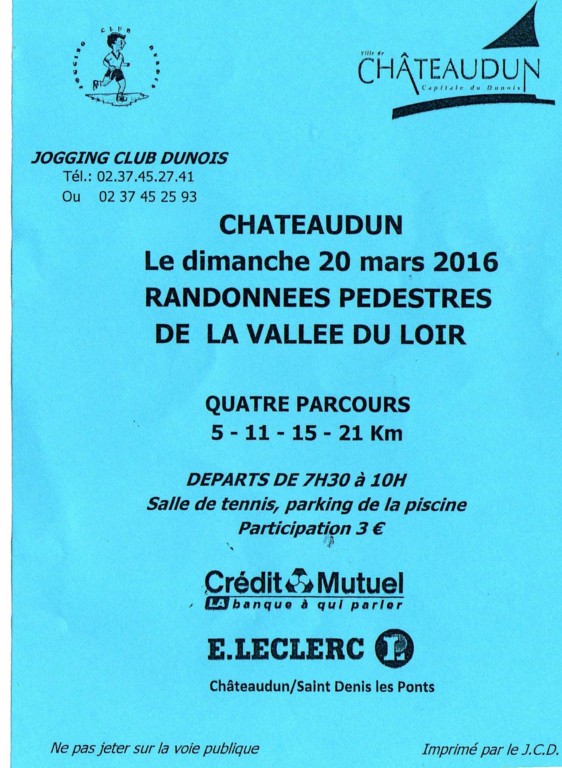 Une randonnée est organisée par les jaunes du jogging club Dunois le dimanche 20 mars sur CHATEAUDUN avec plusieurs distances au programme. Si vous êtes intéressé, vous pouvez cliquer sur l’image d'illustration et vous pourrez consulter tous les renseignements mentionnés dessus (distances, horaires etc)